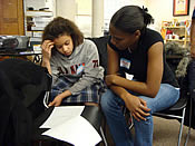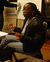 Olu and Monay pass out an article by education activist Herbert Kohl, “The Politics of Children’s Literature: What’s Wrong with the Rosa Parks Myth.” Group members take turns reading aloud, stopping to reflect on what they read or to clarify words or phrases they don’t understand.