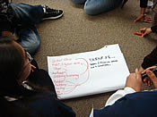 To start, they practice Youth In Action’s “bug in” tradition: a brief introduction and check-in with a closing “bug out!” Pirom demonstrates: “Bug in: My name is Pirom, I’m 16, I’m in the eleventh grade, I go to Health, Science, and Technology High School, and my day has been very long and tiresome. But you know what—I’m still full of energy and ready to do this. Bug out!”