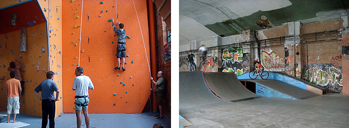 We began with extreme sports like skateboarding, paintball, unicycling, and wall climbing. Each sport has its own space, a different section of the old factory block that was once like a small city. The climbing wall is one of the biggest in Europe; it was built with money obtained from the European Union. We have the only waterproof cycling track in Hungary. Then we added music and arts—a place for bands to play, a recording studio, mural painting. We have festivals for young people across the city to enjoy. And we have our office here, where we train youth volunteers, sixty or seventy next year if our application for financial support is accepted.