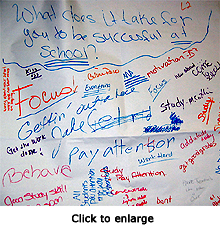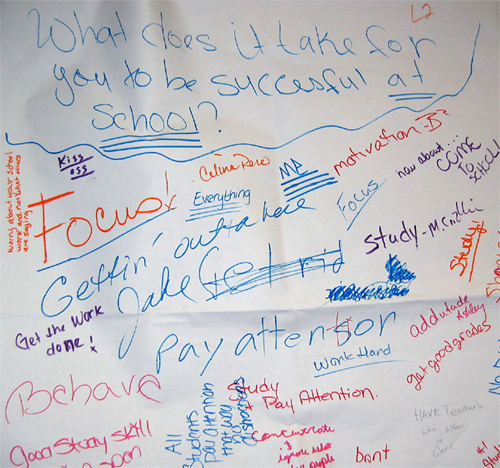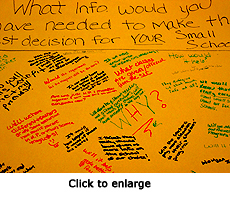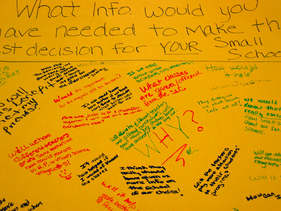 The students also created strategies for testing their classmates' knowledge of small schools, and their confidence in their power as an antidote to the failing educational system. They led peers in "chalk talks"—silent conversations in which participants write their answers to a question on a large sheet of paper, and then respond to each other's messages, adding new questions and often suggestions. At Arlington High School, student researchers placed poll boxes around the school, asking questions like "What do you or don't you understand about small schools?" Manual students created displays for four different "model" small schools and asked classmates to vote on which they preferred.