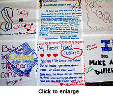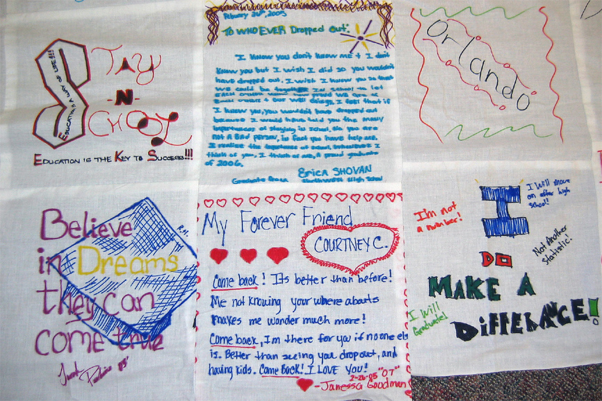 The students at Arsenal Tech also created a huge quilt from individual fabric squares dedicated to a student they knew who had dropped out. "Patricia, you had a lot of potential and I wanted you to become the best you could be," writes one. "School is the gateway drug," states another.